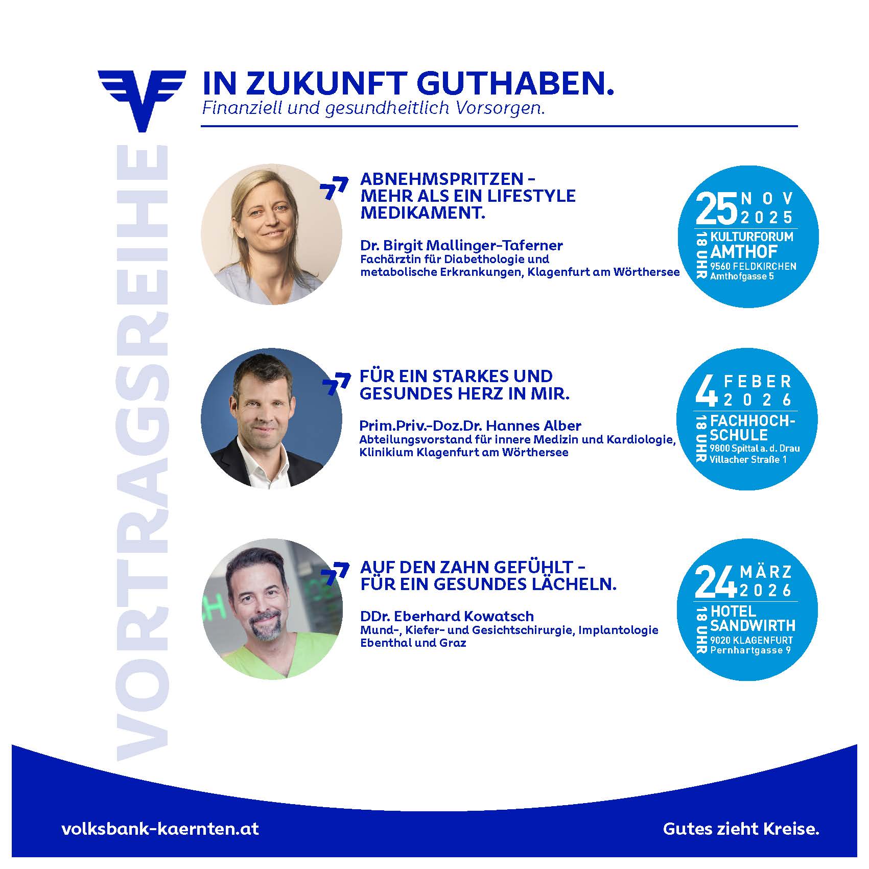 Finanzielle und gesundheitliche Vorsorge sind essenziell für ein sorgenfreies Leben. Eine Kombination aus finanzieller und gesundheitlicher Vorsorge schafft Sicherheit und Lebensqualität. In einer Veranstaltungsreihe unter dem Titel „IN ZUKUNFT GUT HABEN. Finanziell und gesundheitlich Vorsorgen.“ lädt die Volksbank Kärnten zu vier unterschiedlichen, hochkarätig besetzten Fachvorträgen ein.
